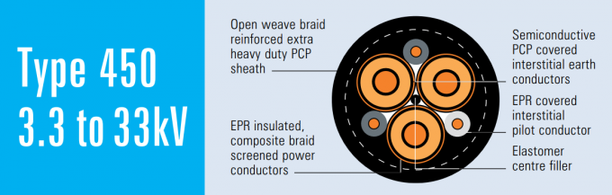 These type 450 mining cables are suitable for the supply of power to a wide range of applications, from dragline cable to slow reeling applications, where copper screened cable is required but lightweight and smaller dimensions are also desired.This type 450 cable is a general purpose cable with metal screened power cores with three pilot cores. It is3.3/3.3 kv to 33/33 kv reeling cables for use with drag-lines, shovels, excavators, wharf cranes, and materials handling equipment. This cable is suitable for slow reeling and trailing applications. This cable is not suitable for use in underground coal mining applications