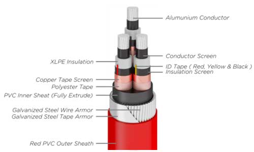 | NA2XSERGBY (Al/XLPE/CTS/SWA/PVC) (Aluminium Conductor, XLPE Insulated, Copper Tape Screen, PVC Sheathed, Steel Wire Armor, PVC Sheathed) |